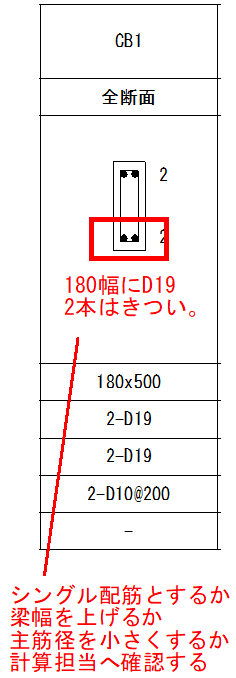 標準図の内容の理解が不十分なまま作業を進めたため、梁幅180に対してD19主筋がダブル配筋となり、納まらない図となっていた。