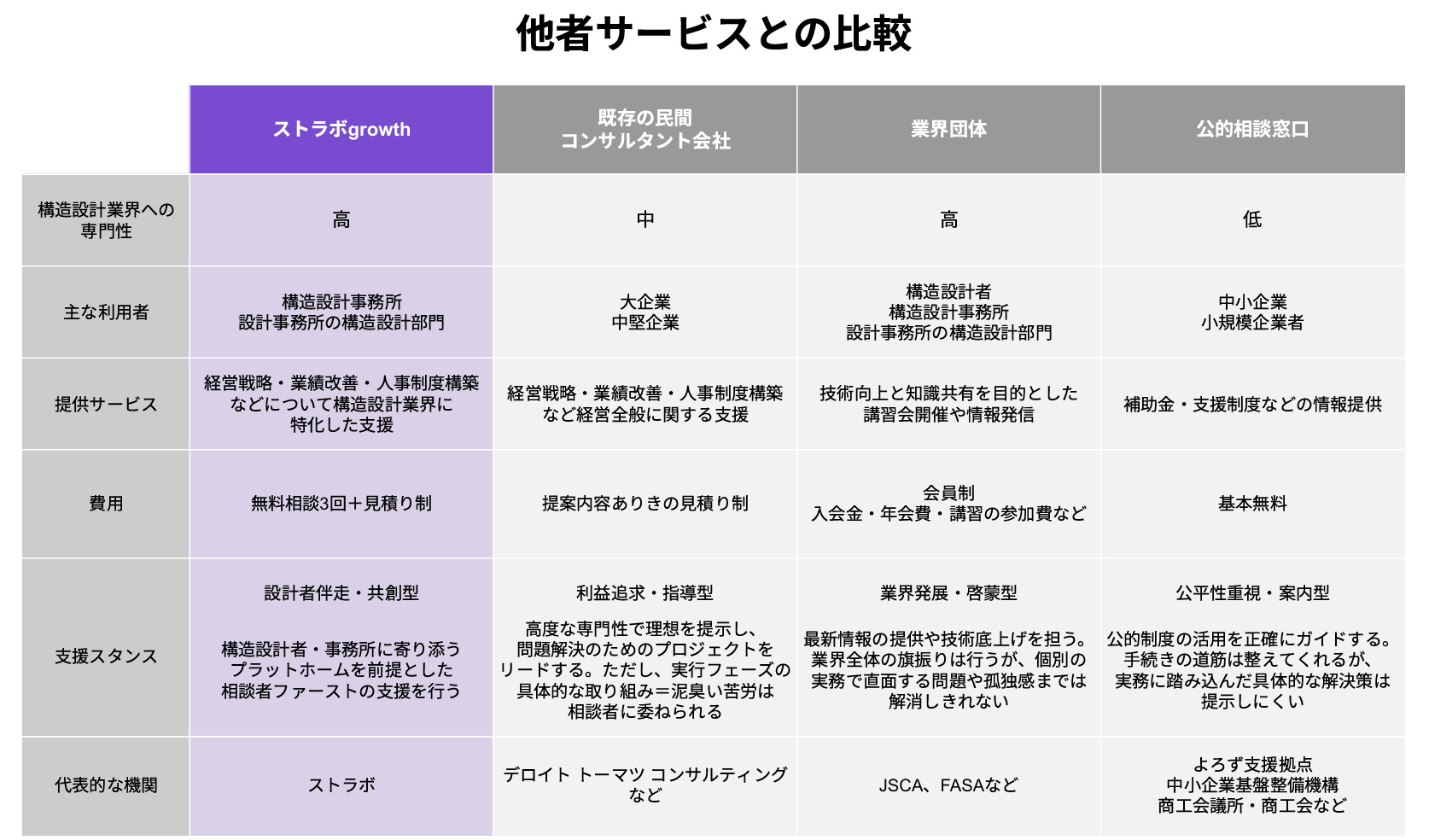 構造設計業界に精通したコンサルタントがそろい、業界特有の課題を的確に把握。「構造設計料アップ」「オリジナル工法の提案」「構造設計プロセスの見える化」など、構造設計業界ならではのテーマに特化したコンサルティングが可能です。