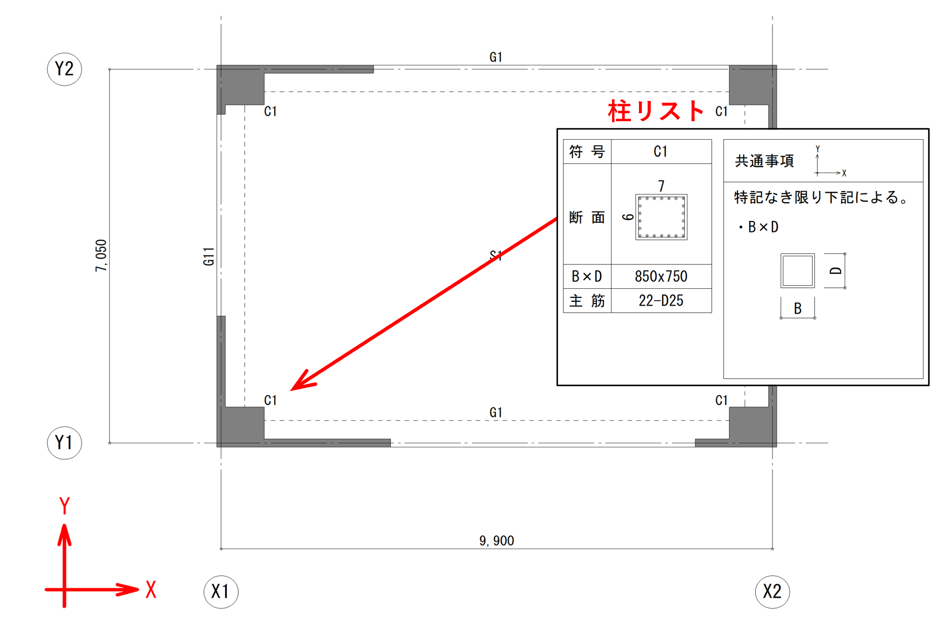 X/Yの矢印の方向は、主に基礎リストや柱リストの鉄筋の方向と照らし合わせるために記載している。