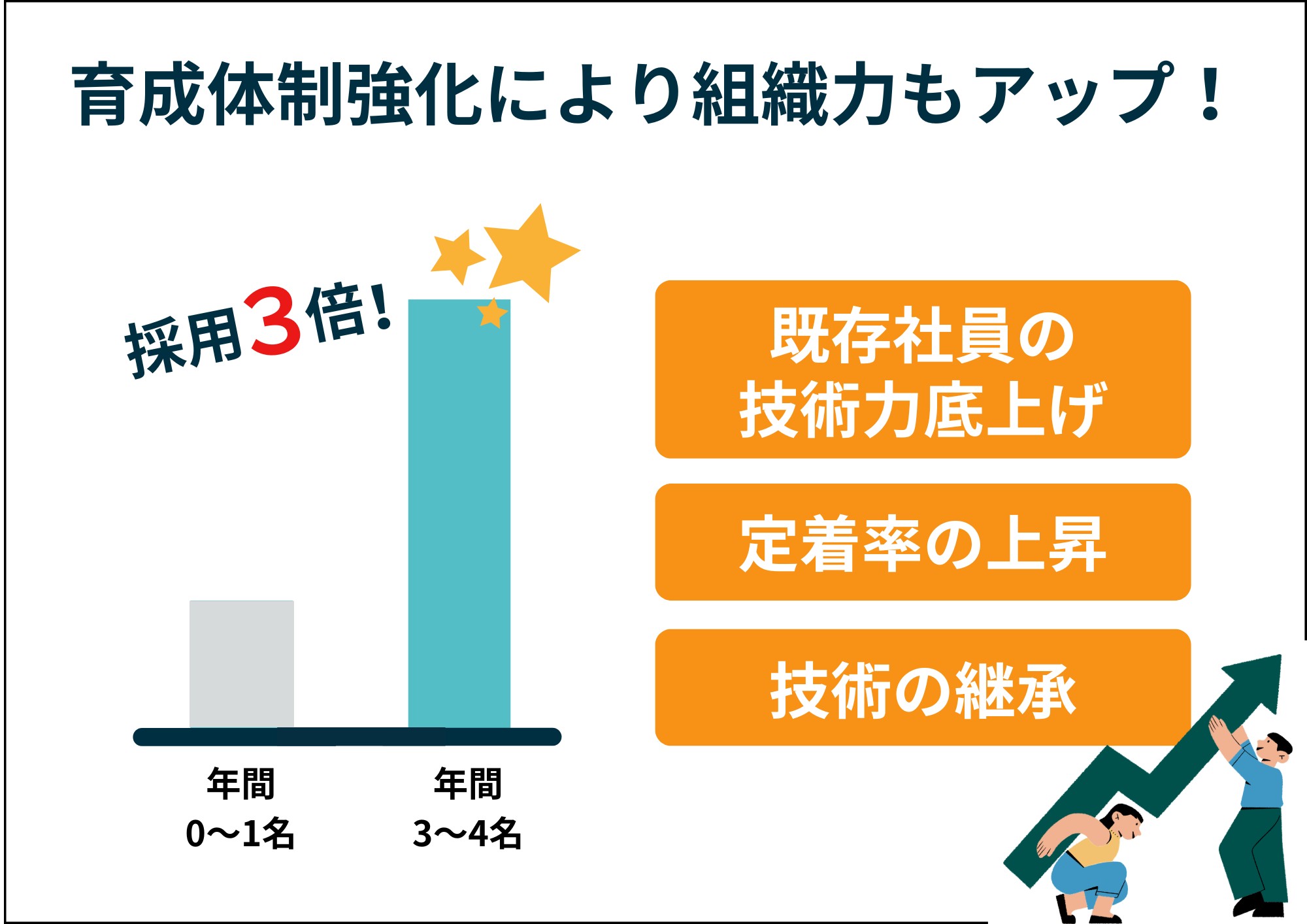 「これまでは、採用してもすぐに辞めてしまうのではないかという不安があり、結局即戦力の経験者採用にこだわってしまいました。しかし、ストラボさんと育成体制づくりに取り組んだことで、採用プロセスでも自信を持って『うちで育てます!』と言えるようになりました。実際に、応募者の数が劇的に増え、定着率も格段に向上しました。
