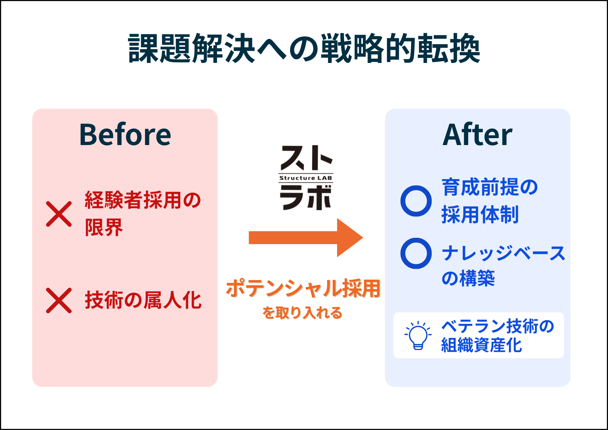 その代わりに、「入社後の育成と本人の学習意欲による補完を期待できるレベルの経験」を持つ人材までターゲットを広げる、具体的には「S造の実務経験はあるがRC造の経験は浅い」場合でも「RC造を学ぶ・挑戦する意欲」を評価して採用するなど「入社後の育成を前提とする」戦略へと転換しました。